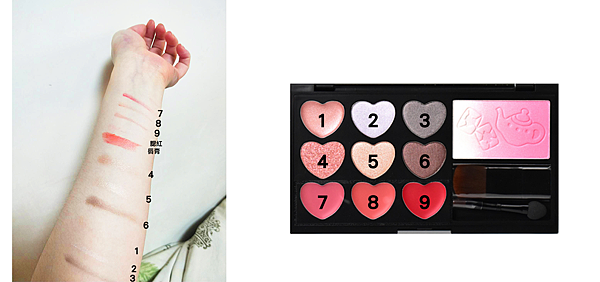 九宮格內上方2排為眼影  最下方那排為唇膏