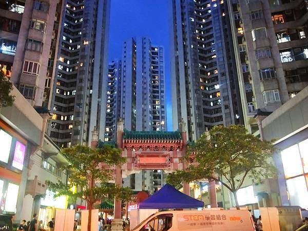 旁邊街道有個漂亮的牌坊,背後是香港這密密麻麻的建築,古代跟現代的交錯