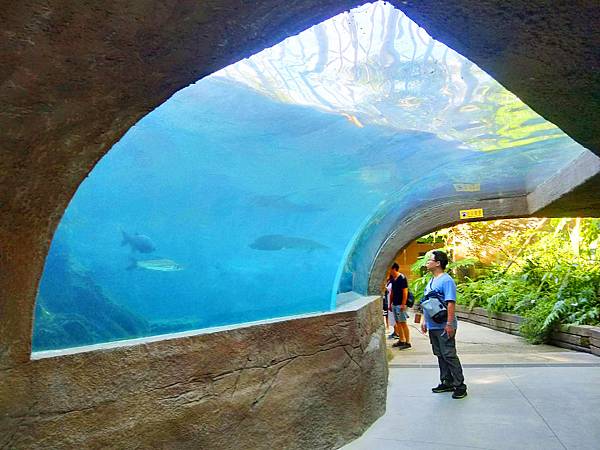 其中也有水生魚類,大水族箱做成一個半拱門,很喜歡陽光透過水,灑在身上的波光粼粼
