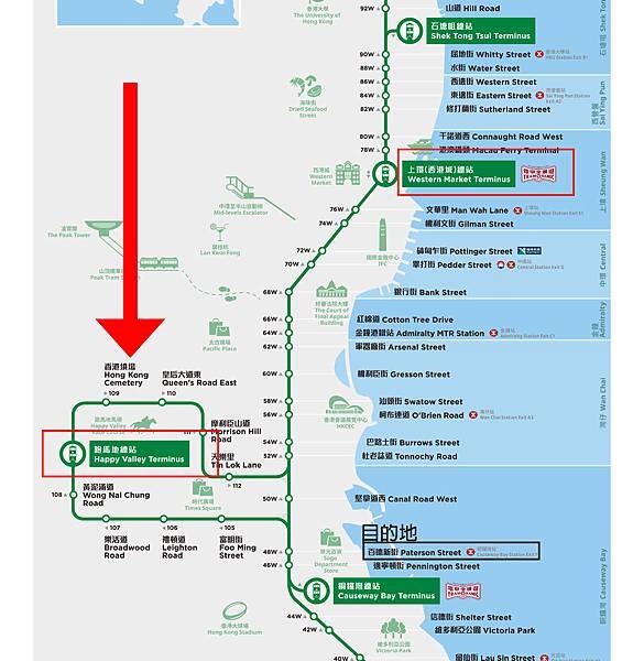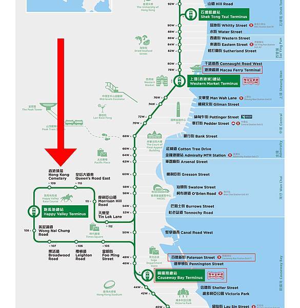 再來看這前面有哪幾個總站,總共有上環總站、跑馬地總站