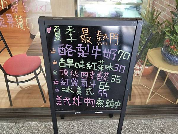 門口的小黑板寫著現在有販售的果汁,果汁記得要確認是不是產季,以免撲空